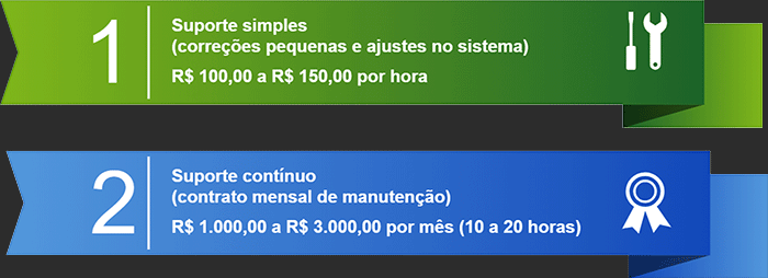 Preço por hora: O suporte e correção de bugs pode ser cobrado por hora. O valor para problemas mais complexos é de R$ 150,00 por hora. Se o serviço envolver correções simples, o preço será de R$ 100,00 por hora, para um desenvolvedor PHP sênior.
